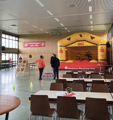 -- Tischtennisplatten, Geschicklichkeitsspiele, verschiedene Brett- und Kartenspiele sowie eine große Hüpfburg in der Halle.